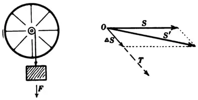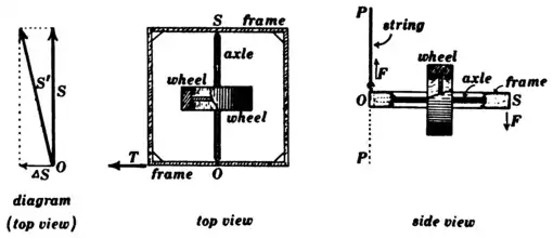 movable frame as shown in Fig. 7. By taking hold of the frame it is impossible to exert a torque upon the wheel except about an axis perpendicular to OS, friction at pivots being ignored. If the frame be suspended by a string as shown in Fig. 7 (side view), the pull of the earth combined with the pull of the string constitutes a torque as indicated by the arrow T in Fig. 7 (top view). The effect of this torque during a short interval of time is to produce a certain amount of spin, or spin-momentum, ΔS about T as an axis, and the resultant axis of spin