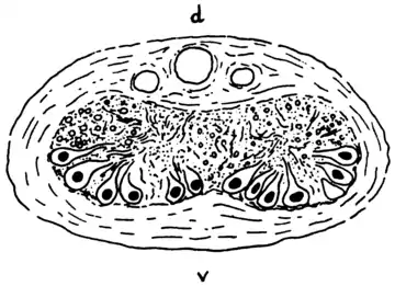 Fig. 4. Transverse Section of the Ventral Nervous Cord of an Earthworm, showing the ganglion-cells on the ventral side (v) and the nerve-fibers and neuropile on the dorsal side (d).