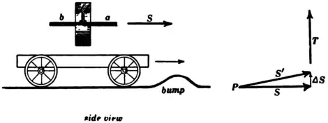 S represents the spin-momentum of the fly-wheel at a given instant, S'represents the spin-momentum at a later instant, ΔS represents the increment of spin-momentum, and the arrow T represents the torque which must act upon the fly-wheel shaft. In order to produce the torque T, the bearing a must push the front end of the engine axle to the left (with reference to the driver), and the bearing b must push the rear end of the engine axle to the right (with reference to the driver); or, in other words, the front end of the engine axle pushes to the right against the bearing a, and the rear end of the engine axle pushes to the left against the bearing b. Thus, there is a tendency for the front end of the car to be suddenly thrown to the right, when the car rises upon the bump, and the supporting springs of the car body are subjected to a skew action which is apt to break them.