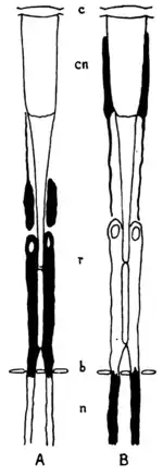 Fig. 1. Two Elements from the Compound Eye of a Shrimp, showing the distribution of pigment in the light (A) and in the dark (B). b; basement membrane; c, cuticula; cn, cone; n, nerve fiber; r, retinular cell. elements from exposure to excessive light or to open them to the full effects of dim light. The investigation of these organs dates from comparatively recent times and van Rynberk (1906), who has recently summarized our information about them, has shown that the accounts already given are in many respects contradictory. Hence what I shall have to say I shall draw mostly from those fields with which I am somewhat acquainted at first hand.