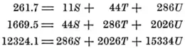 Normal equations for each constant are formed from these observation equations by multiplying each equation by the coefficient of the constant concerned in the equation and adding. This gives us three equations containing three unknown quantities. These unknown quantities are determined by any method and substituted in the general formula for and respectively. For example, in 1900, before the census returns for that year were available, the process above outlined yielded the following equations: