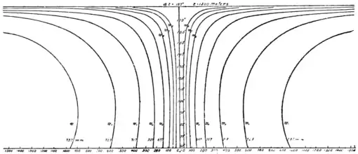 and stripped of their branches; buildings were overturned and destroyed in every conceivable way; heavy iron girders and stone work of the bridge were destroyed; and in short almost limitless powers seem to have been at the disposal of this great vortex. Fig. 3 shows a section of this vortex, the relative distance apart of the tubes, and the part which has been cut off or truncated at about one third of the distance from its lower plane of reference, several hundred meters below the surface of the ground. It has been shown that this St. Louis tornado was about 47 times as efficient as the large Cottage City waterspout in its lifting power, and that at the surface of the ground it developed somewhere between 150 and 250 meters per second; that is, 340 to 560 miles per hour. While it is not probable that these enormous theoret-
