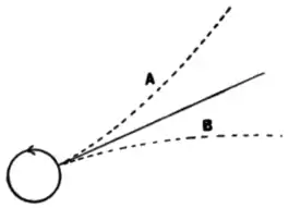 Fig. 14. called underspin, the upward force due to the spin is greater than its weight, thus the resultant force is upwards, and the ball is repelled from the earth instead of being attracted to it. The consequence is that the path of the ball curves upward, as in the curve A, instead of downwards, as in B, which would be its path if it had no spin. The spinning golf ball is in fact a very efficient heavier than air flying machine, the lifting force may be many times the weight of the ball.