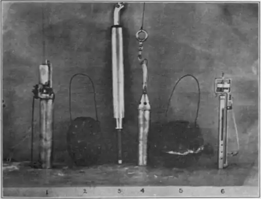 A Set of Sounding Instruments. 1, water bottle; 2, thirty-five pound shot; 3, Thompson ball-cutting sounding rod; 4, bottom specimen cup; 5, sixty pound shot; 6, deep-sea thermometer. (Photograph by DeLong.)