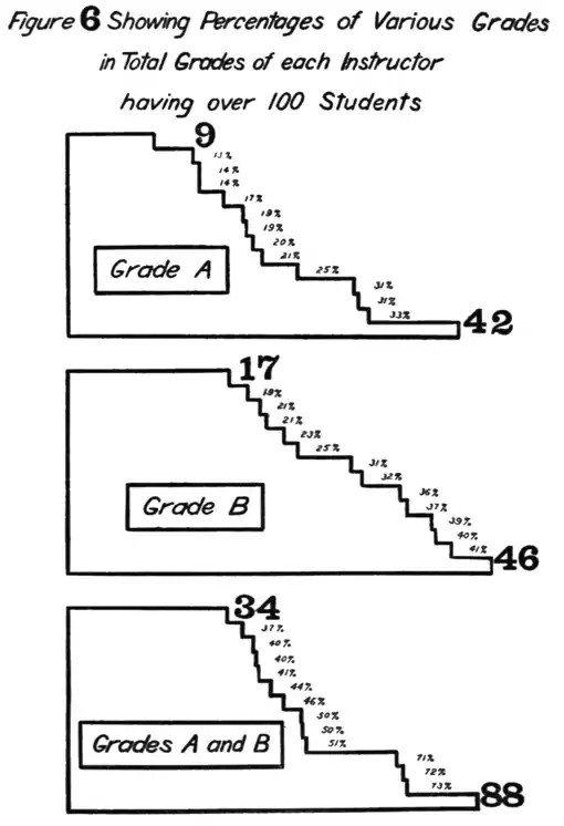 Figs. 6 and 7 show the range of percentages for each grade, A-E, for each instructor in Bowdoin College, Maine, giving in 1907-08 over