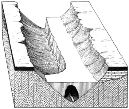 Fig. 8. Block Diagram to show the Formation of the Travertine Natural Bridge at Pine, Arizona. This bridge was formed by the deposits of travertine derived from the springs on the east. (In the diagram the height of the bridge is exaggerated.)