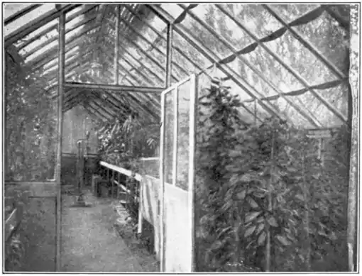 There is a separate house (Fig. 4), bowed around the north side of the grounds, for heredity researches upon the higher vertebrates. Each of the sixteen cages has an outwardly-sloping cement floor, wire screen ventilators, heating pipes and electric lights, and opens into a garden