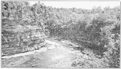Cathedral Gorge, a postglacial entrenchment of Esopus Creek at the Tongore site. The preglacial gorge lies at the north side of the valley buried beneath 250 feet of drift. (Photograph by Board of Water Supply.)