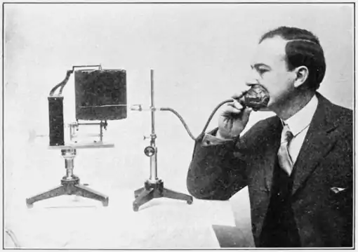 Fig. 1. Recording the Voice. The waves from the mouth proceed down the wide tube to the rubber membrane at the end. The vibrations of the membrane are recorded by a straw lever on a surface of smoked paper around a revolving cylinder.