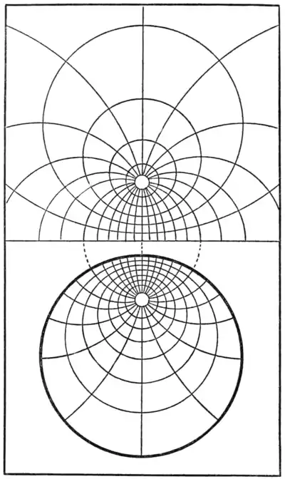 If we think of the cross-section of a tree, further growth must necessarily occur in directions normal to the surface of the last year ring. This causes the year-rings and pith-rays to form a system of orthogonal trajectories. In Fig. 4 such a system, consisting of two conjugate pencils of circles, is shown, and is caused by a rate of growth greater in one direction than another.