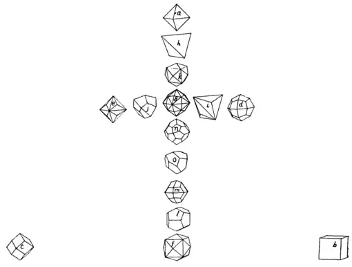 The law of symmetry permits any symmetrical half of these faces to appear independently on the crystal, and the crystal fulfils the law of symmetry, and this may be done in three ways. (1) We may take all the faces in half the octants, or half the faces in each octant, and in the second case we may begin in the second octant (2) with the face adjacent to the initial face, or (3) with a face not adjacent. In accordance with the first law the half of the faces of the octahedron forms the tetrahedron which we naturally place in the figure, as (h) directly beneath the octahedron from which it is derived.
