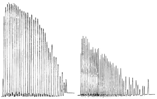 The ergograph was devised by Mosso, an Italian psychologist, and is used to measure muscular fatigue. A weight is lifted with one finger every alternate second until the muscle is tired out. Each lift is recorded on a vertical line and the sum total of lifts and lengths of lines are indicative of muscular action and voluntary control.