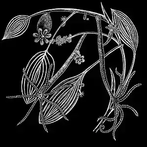 in its earliest stage of development, of a simple elongated sac, with an opening which answers the purpose of a mouth. Around the mouth are a series of hollow filaments which it can entirely withdraw, and it then looks like a minute tubercle. The tentacles are roughened by the clusters of thread-cells, or enidæ, already described. The threads have been observed in some instances to be, when extended, as much as eight inches long, and are shot out, it is thought, by the propulsive power of a liquid injected into the central cavity. It grows erect, horizontal, or inverted, as the case may be, and lives only upon animal food. The little creatures are extremely voracious and not over-nice. Trembley observed two hydras attack, at the