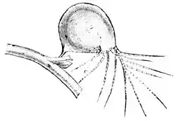 The valve is attached on all sides to the bladder, excepting by its posterior margin, which is very thin, and rests on a collar or rim, which dips deeply into the bladder. The valve can only open inward;