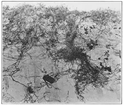 The flora of the dry valleys is very similar to that of the prairie regions of the state, being especially rich in grasses. The principal widely distributed plants of the dry valley are: switch grass (Panicum virgatum), wheat grass (Agropyrum pseudo-repens), blue joint grass (Calamagrostis canadensis), wild rye grass (Elymus canadensis), red top (Agrostis alba), tickle grass (Agrostis hiemalis), rattlesnake grass (Panicularia americana), and a number of sedges (Carex trichocarpa, C. filiformis, etc.). All of these species are valuable forage plants and they are all included in most of the hay that is put up from the valleys. Besides these economic plants there are many other herbaceous members of the prairie flora that have wandered into the Sand Hills and have found congenial homes in these dry valleys.