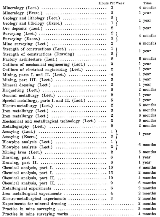 The special courses noted are given by a faculty consisting of 4 professors, 4 assistant professors, and 1 lecturer; assisted by 2 professors from the College of Law. A few are given in the civil or electrical engineering departments, being required of or open to election by students in mining. At Kyoto the faculty of the Institute of Mining and Metallurgy consists of Professors Jisaburo Yokobori, Daikichi Saito, Viscount Tadashiro Inouye, Toshio Watanabe, all graduates of the