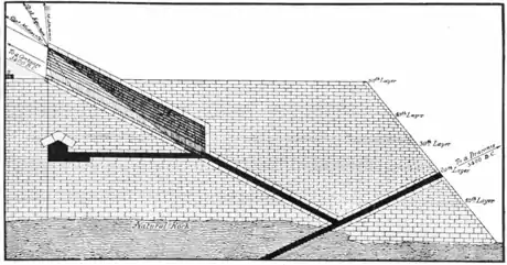 descending passage which looked at the pole-star and thence by an ascending one at about the same angle which opens into it. It is one hundred and fifty-seven feet long, twenty-eight feet high and about eight feet wide. Along the center of its floor a smooth stone flagging ascends, flanked on either side by raised curbs or ramps half as wide each as the central paved pit. These curbs are not continuous but are cut at approximately equal intervals of about five and a half feet by notches with vertical edges. There is no doubt that these were for the insertion of benches, as the notches tally on opposite sides. At about sixteen feet from the bottom the central incline stops in a vertical wall which descends to a horizontal pavement, giving entrance to the corridor which runs to the Queen's apartment.