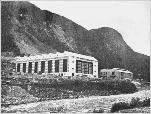 Fig. 12. Rjukan-fos Saltpeter Works. The water is carried from the upper power house to the lower through a tunnel just within the walls of the cliff. The current from both power houses will be brought to this building, in which will be utilized more electric power than any single plant in the world.