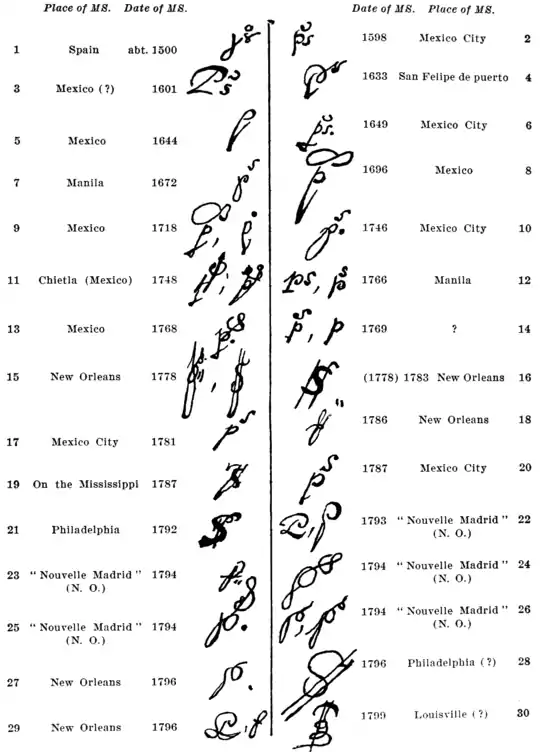 Fig. 3. Symbols foe the Spanish Dollar or Peso, traced from MS. letters, contracts and account-books. No. 1. The historian, Dr. Cayetano Coll y Toste, of Porto Rico, says that this was the written symbol "during the time of Christopher Columbus." Nos. 2, 3, 6, 9, 10, 11, 13, 14, 17, 20 are traced from MSS. owned by W. W. Blake, Avenida 16 de Septiembre 13, Mexico City. Nos. 15, 16, 18, 19 are from Draper Coll. in Wis. Hist. Libr., Madison; Nos. 15, 16 in Clark MSS., Vol. 48 J, pp. 37, 38; Nos. 18, 19 in Clark MSS., Vol. 1, pp. 136, 143. Nos. 4, 5, 7, 8, 12 are from the Ayer Coll. Newberry Libr., Chicago. No. 21 from letter of Robt. Morris to the Hon. Jeremiah Wadsworth, Esq., Hartford, Conn., in Harper Mem. Libr., University of Chicago. Nos. 22, 23, 24, 25, 26, 27, 28, 29, 30 are from MSS. in Chicago Hist. Soc. Libr.; No. 22 in Menard Coll., Vol. 64; Nos. 23, 24 in Menard Coll., Vol. 60, p. 187; Nos. 25, 30 in Autogr. Letters, Vol. 61; No. 26 in Menard Coll., Vol. 62; Nos. 27, 29 in Menard Coll., Vol. 63; No. 28 Autogr. Letters, Vol. 71, p. 76.