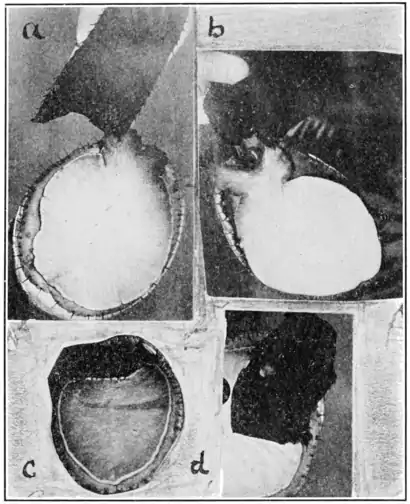 Feeding Abalones from the Hand, a, b, grasping kelp with anterior processes of foot; c, drawing kelp under foot; d, eating hole in kelp.