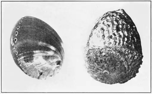 the awabi, is a smaller species and the holes of the shell are relatively large, so that only the central part is of value, chiefly for use in inlaying. Gathering abalones is especially carried on by women divers, who swim out to the fishing grounds and work in depths of from six to eight fathoms. Pearls are not often found, but the meat is dried and sold as dark red disks strung on sticks.
