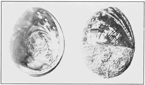 | Interior View of the Red Abalone Shell, showing pearly center within the muscle scar. | Shell of the Green Abalone. The anterior portion polished. |
