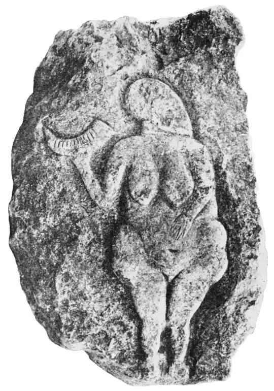 Pl. II. Bas Relief from the Rock Shelter of Laussel (Dordogne). representing a nude female holding a bison horn; Aurignacian age. After Lalanne. "L'anthropologie," XXIII., 131, 1912.