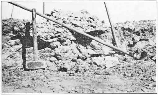 In a cutting which shows the layer of caliche with almost no overlying material. The tools shown are the only ones needed in mining caliche.