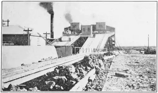 Carts or trains of small dumping cars carry the caliche to the maquina, as the refining plant is called. Here it is first crushed into pieces no larger than a man's fist. From the crushers it goes up inclined planes to the boiling tanks, or cachuchos as they are still known, though earthen pots have been replaced by great iron affairs 33 feet long, 9 feet wide and 8 feet deep, capable of holding 70 tons. The newest maquinas have twenty to thirty of these tanks. When the charge of caliche is in, water is added, steam is turned into a coil of pipes which runs around inside the tanks, and the boiling process begins to dissolve out the soluble nitrates from the insoluble and worthless earthy substances. Thus the industry, which in one respect owes its existence to absence of water, must have water in order to operate, for nowhere are there large amounts of caliche rich enough to ship without refining, and the process of leaching is the only economical method of refining.