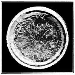 Fig. 6. Crystals of Needle-like or Monoclinic Sulphur. When first formed they are bright yellow. After standing for a few hours they change to a dull yellow color and become very brittle. A microscopic examination of a fragment shows that it is now made up of minute rhombic crystals (Fig. 7). crystallized, and the stable or completely crystallized mineral.