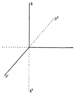 Fig. 7. passing from -space to -space. For here we have added the up-and-down motion to the right-and-left and the forward-and-backward motions. Here any point is located by means of its distances from three mutually perpendicular planes, each plane being formed by two of the three lines that can be drawn mutually perpendicular to one another. In Fig. 7, —representing directions to the right, hitherward and upward, respectively—are the axes of reference, each being perpendicular to the other two, forming the mutually perpendicular planes, .