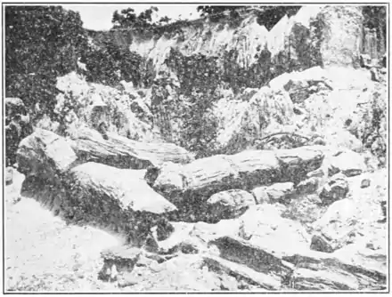 Fig. 2. A Petrified Log about Six Feet in Diameter and Twenty Feet Long, Split throughout its Length. Behind it is seen the erosion wall. Beneath the log evidences of erosion may also be seen.