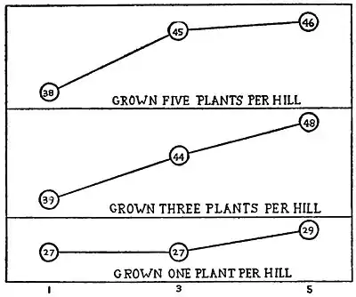 continuously at the rate of one, three and five seeds per hill[1] for six years, he finds the yields given in the accompanying diagram, 1. Apparently the seed grown under competition yields higher than that grown under thin planting.[2]