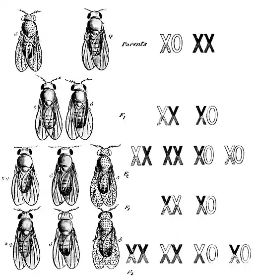 Fig. 4. Diagram illustrating the results of crossing a yellow (stippled), white eyed male to a gray, red-eyed female of Drosophila. To the right the sex chromosomes are represented, colored in the same way as the flies.