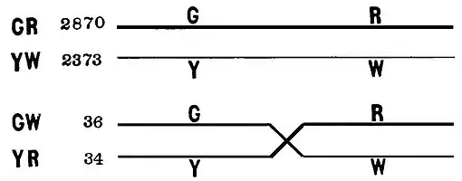 Fig. 5. The two upper lines represent the two sex chromosomes of the female, showing their original composition, viz., GR and YW. The lower line shows "crossing-over" between the two pairs. The numerals to the left give the F2 males, whose composition is the same as that of the chromosome that stands next to them. The males receive one or the other of these chromosomes from their mother.