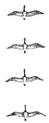 Fig. 5. Echelon Flock Formation. The usual flight formation of large birds. All birds can see ahead, and towards one side, making the best arrangement for protection. The protective efficiency of the formation is little affected by an increase in the number of birds of the flock.