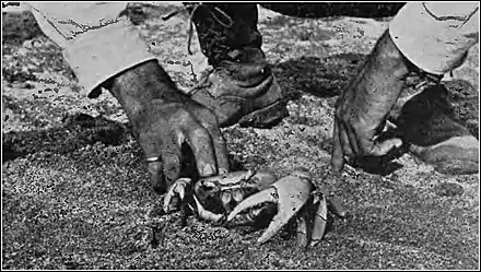 In the slow rivers of the lowlands the most characteristic animals were the shrimps and prawns which often possessed greatly elongated claws. Curious little shrimps belonging to the family Atyidæ were quite common. These crustaceans have the first two pairs of legs modified into little brush-like forceps with which they scrape the microorganisms from the soft bottom or from aquatic plants. Many land and freshwater crabs lived along the shores of the rivers. Among these Cardiosoma guahumi was most conspicuous on account of its blue color and large size. This big crab digs holes in the mud beneath the trees near the mouths of rivers. It comes out at night seeking food and climbs the trees to eat the leaves. It was a great sight to watch hundreds of these crustaceans on the mud flats, sitting motionless in the glare of the jack-light.