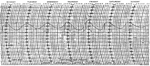 Fig. 7. Thermograph Chart Ruled for Integration in Terms of Rate of Growth. The areas of the separate figures are to be determined by a planimeter and multiplied by the factor expressing the rate of growth prevalent during the period covered by the figures. Record from Coastal Laboratory, June 16-23, 1913.