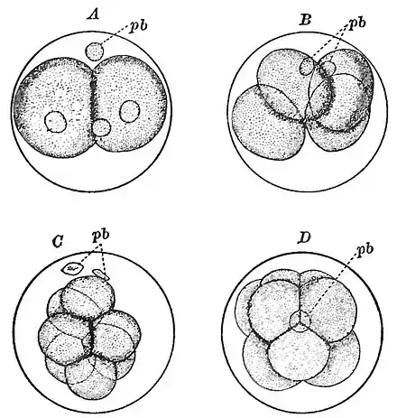 Fig. 13. Four Cleavage Stages of the Sheep; pb, polar bodies. (After Assheton.)