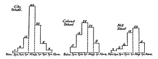 To what extent these differences are due to difference in racial intellectual ability, and how much to environmental influences, differences in physiological age, or other subtle factors, can not be dogmatically stated. They are certainly not due to difference in school training. In order, therefore, to make the comparisons as just as possible, and at the same time ascertain the extent of the influence of environment, the white children were divided into two groups—city children and mill