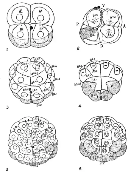 Fig. 30. Cleavage of the Egg of Styela, showing distribution of the yellow protoplasm (stippled) and of the clear and gray protoplasm to the various cells, each of which bears a definite letter and number.