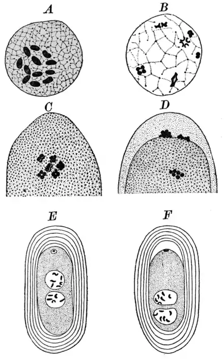 Fig. 35. Oogenesis of a Nematode Worm (Ancyracanthus). A, egg mother cell containing 12 chromosomes before their union into pairs; B, early stage of first maturation division; all the chromosomes have united into 6 pairs, each of which has split in two so that the pairs are really four-parted (tetrads); C, the six tetrads in the first maturation division; D, egg containing 6 chromosomes, after both first and second maturation divisions; the eliminated chromosomes are shown as the polar bodies at the margin of the egg; E and F, eggs after fertilization; the egg nucleus is above and contains 6 chromosomes, the sperm nucleus below and contains 5 chromosomes in one case and 6 in the other; the former becomes a male with 11 chromosomes, the latter a female with 12 chromosomes.