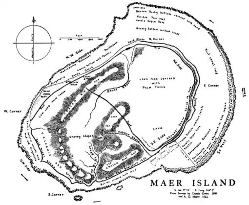 On the western side of the island, the crater rim rises to a height of about 750 feet, the seaward slope being steep and evidently determined by the angle of repose of the ejected ash.