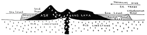 as has been shown by Andrews, Griffith-Taylor and Hedley, was once above the sea but is now submerged to a depth of from 90 to 180 feet. Shattered fragments of the old limestone are found imbedded in the ash crater of the volcano.