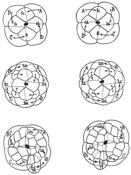 Fig. 43. Inverse Symmetry of the 3d, 4th. 5th and 6th cleavages. The cells 1a-1d, 2a-2d and 3a-3d give rise to all the ectoderm; 4d or M gives rise to mesoderm; A, B, C, D to endoderm.