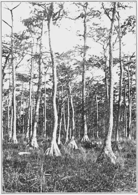 Pond Cypress (Taxodium ascendens) in Very Shallow Flatwoods Pond (Dry at this Time), Pasco Co., Florida. April, 1909. This species is readily distinguished from T. distichum by its crooked trunk and coarser bark, among other things.