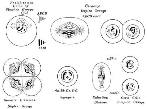 Fig. 59. Cellular Diagram Corresponding to Fig. 58, Showing the Union of Maternal Chromosomes (ABCD) and Paternal Ones (abcd) in Fertilization, their distribution in cleavage, their union into 4 pairs (Aa, Bb, Cc, Dd), in synapsis and the separation of the pairs in the reduction division. Only 2 of the 16 possible types of germ cells are shown. (From Wilson.)