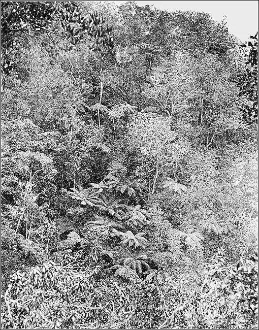 trees are Marattias and Dunaeas, with Nephrodiums and Aspleniums of many varieties. Gleichnias and Davallias fringe the trails, while Lomarias, Trichomanes and Polypodiums twine about the tree trunks and epiphytic Acrostichums, Elaphoglossums, Polypodiums and Lycopodiums settle on the stems or branches of Cyathea and other trees. The beautifully delicate Hymenophyllum and Trichomanes form thick carpets over damp cliffs, and over living or dead trunks. Even high up on trunks or branches they may form dense tufts or lace-like curtains. These filmy ferns here take the place, in part, of the mosses of our northern forests, on soil, rock and trunk. But the mosses themselves are here also to war with their competitors for standing ground and sunlight. Mingled with Collema and other lichens, the mosses form spongy tufts