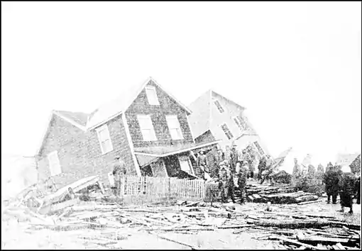 In order fully to appreciate the effects of storms upon the New Jersey coast, it is necessary to keep in mind some of the conditions affecting wave energy. The destructive power of a wave depends in part upon its size, and this in turn partly upon the water depth. Waves usually break and dissipate their energy when they come into water of a depth equal to the wave height. Hence, the deeper the water immediately at the shore the larger the waves which can attack it, and the greater the damage they will effect at that point. It follows from this that the rise of the tide must increase the destructive power of storm waves on the coast, not only because it brings the zone of wave activity farther in upon the shore, but also because the deepening of the water as the tide rises against the steeper upper part of the shore profile permits larger and more powerful waves to break against the shore cliffs. In all the recent storms the chief damage to the New Jersey coast occurred at the high-tide periods, and the citizens worked feverishly during low water to prepare for the violent wave attack which they knew would ensue at the next high tide.