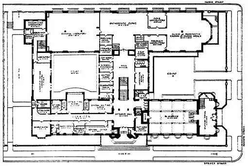 The new building is in the Tudor style of architecture which prevailed in the time of Henry VIII. and might be described as collegiate gothic, being in keeping with other late buildings, constructed of Indiana limestone and hardburnt brick. It was designed by John T. Windrim. Ground was broken on September 24, 1912, and the cornerstone was laid on May 3, 1913. The building has a frontage on Spruce Street of 242 feet, and a depth to Irving Street along Fortieth Street of 161 feet; It is built in the form of the letter H and has three stories over a high basement. The benefaction of Dr. Evans includes this building with its equipment and a substantial endowment fund.